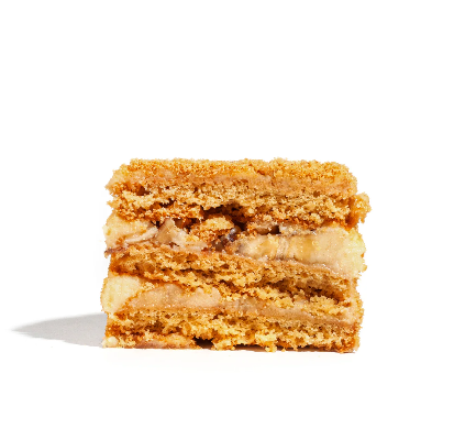۲.یک سمفونی بافتی: دسر دارای تعامللذت بخش از بافتها است. بیسکویت عسلی ترد ، خامه روسی خامهای، موز نرم و گردوی ترد، تجربه متفاوت و رضایتبخشی را در هر تیکه ارائه میدهند.