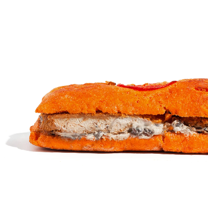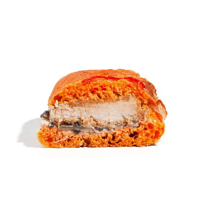 این شنیتسل لذیذ در نان چاباتای گوجهای قرار گرفته که عطر و طعم ملایم گوجه را به بافت نرم و دلپذیر خود اضافه کرده است. ترکیب ویژهی سس قارچ، ماست و خامه، طعمی خامهای، لطیف و متعادل ایجاد میکند که کاملاً با شنیتسل بوقلمون هماهنگ است.