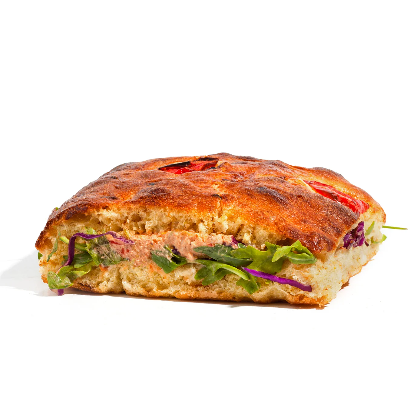 ۱.نان فوکاچیا: ما از نان فوکاچیا که به که به صرت روزانه پخت میشود، استفاده میکنیم ، که به دلیل بافت سبک و مطبوع، طعم ملایم شور و پوسته ترد لذت بخشی ایجاد میکند . پایهای عالی برای ساندویچ خوش طعم ما.